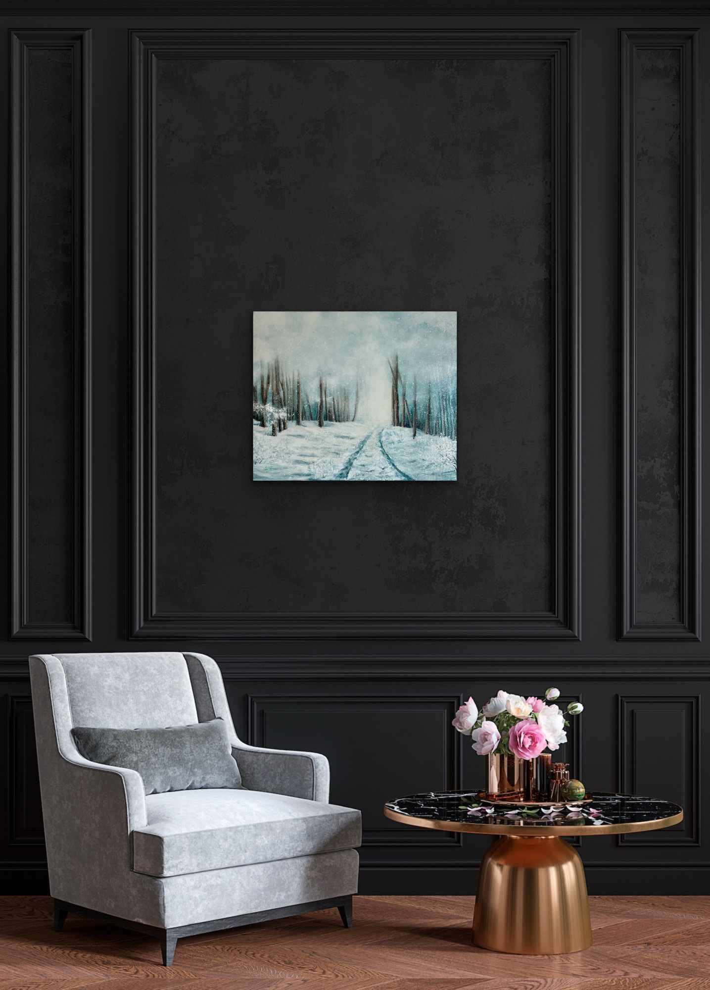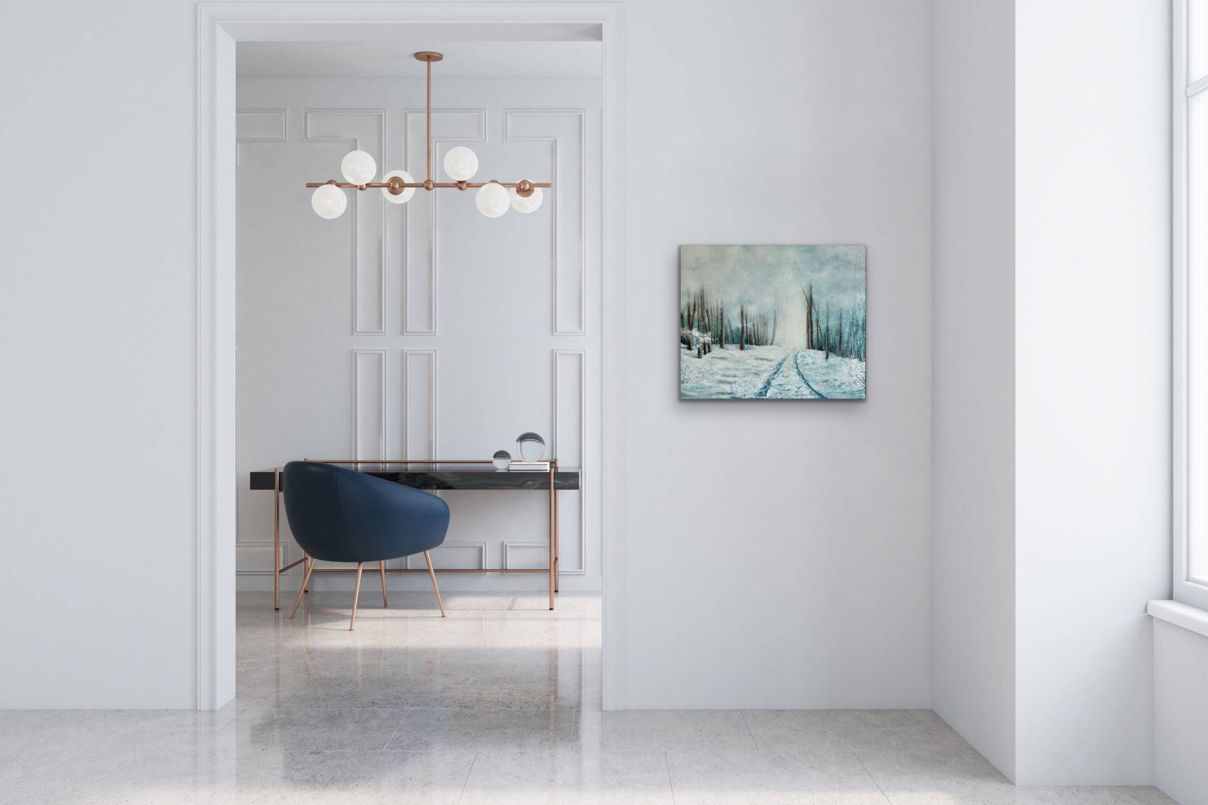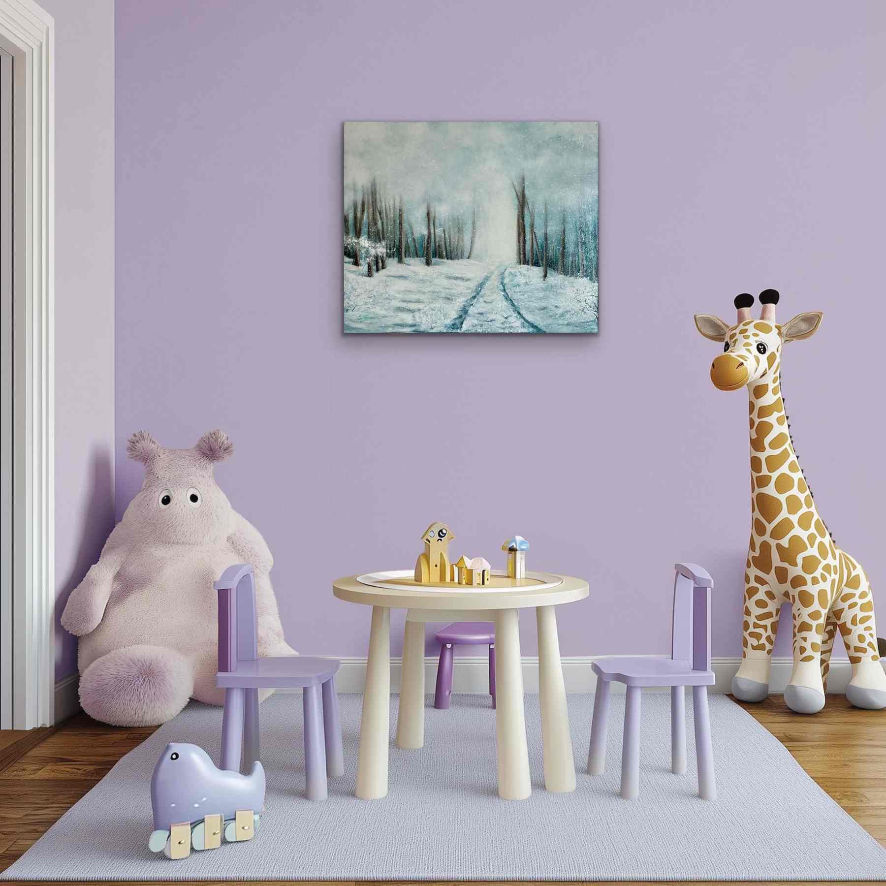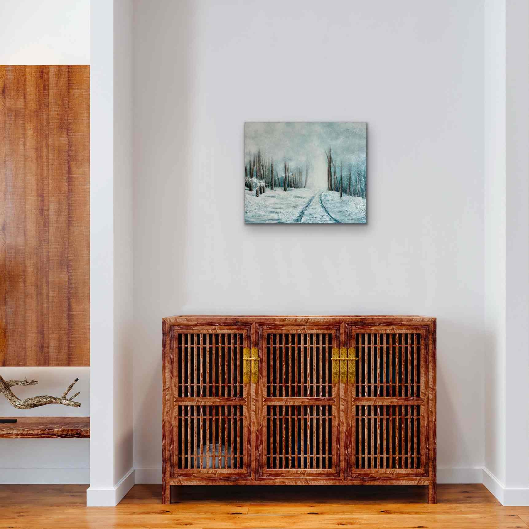 Les nuances de blancs, de gris et de bleus se mêlent à des touches plus chaudes pour suggérer le contraste entre le froid de la neige et la chaleur de la lumière lointaine. Ce tableau paysage hivernal invite au calme, à la rêverie et à l’évasion intérieure, tout en apportant une touche de magie discrète à votre intérieur.