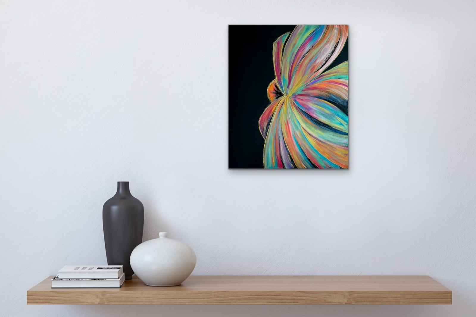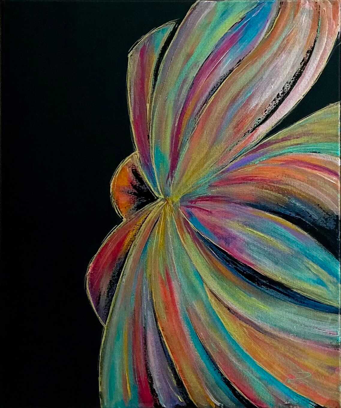 « Nacres » (46 x 55 cm) est une œuvre vibrant d’énergie et de contrastes. Sur un fond noir intense, une fleur se dessine en éclats de peintures nacrées, mêlant les nuances chaudes et froides dans un mouvement presque hypnotique.