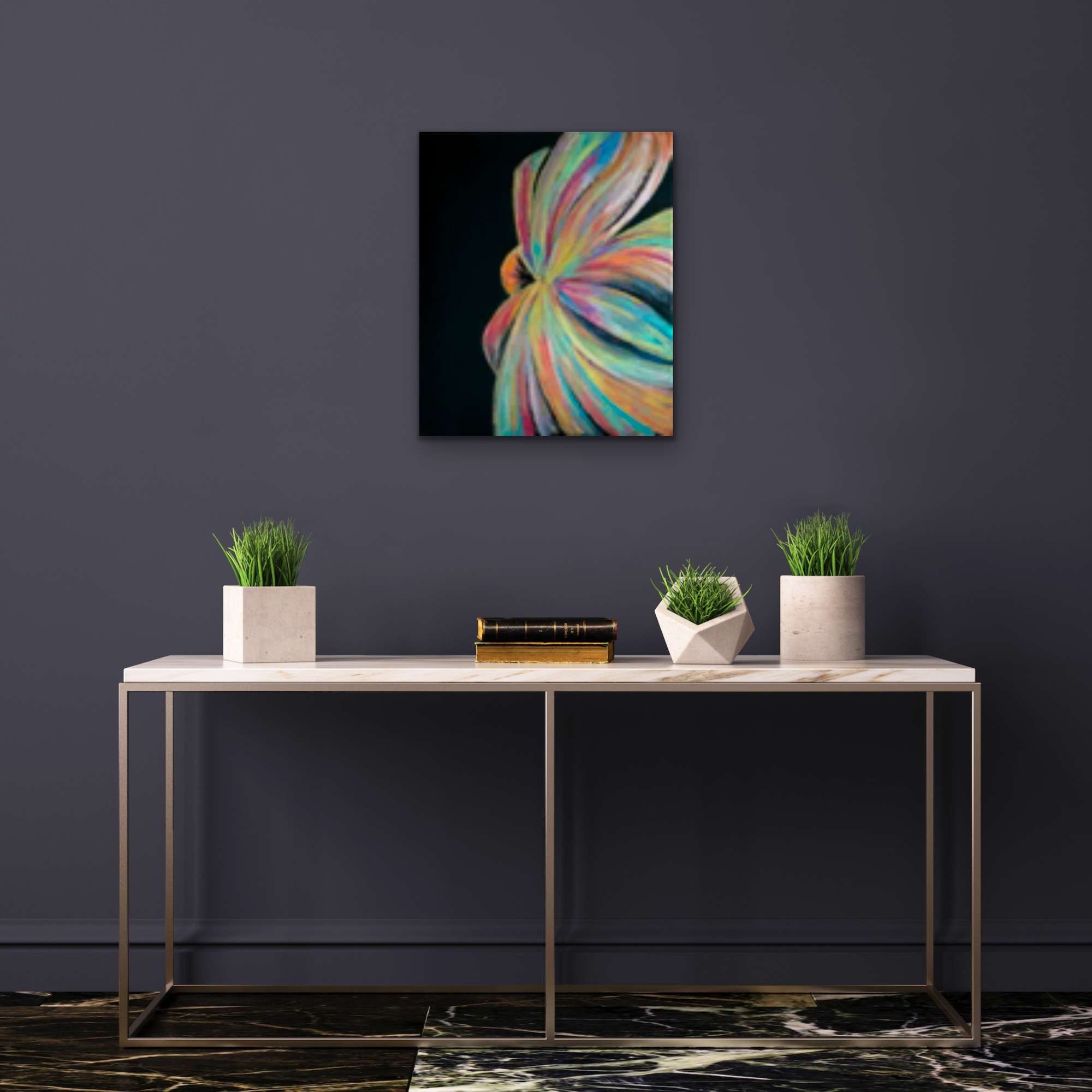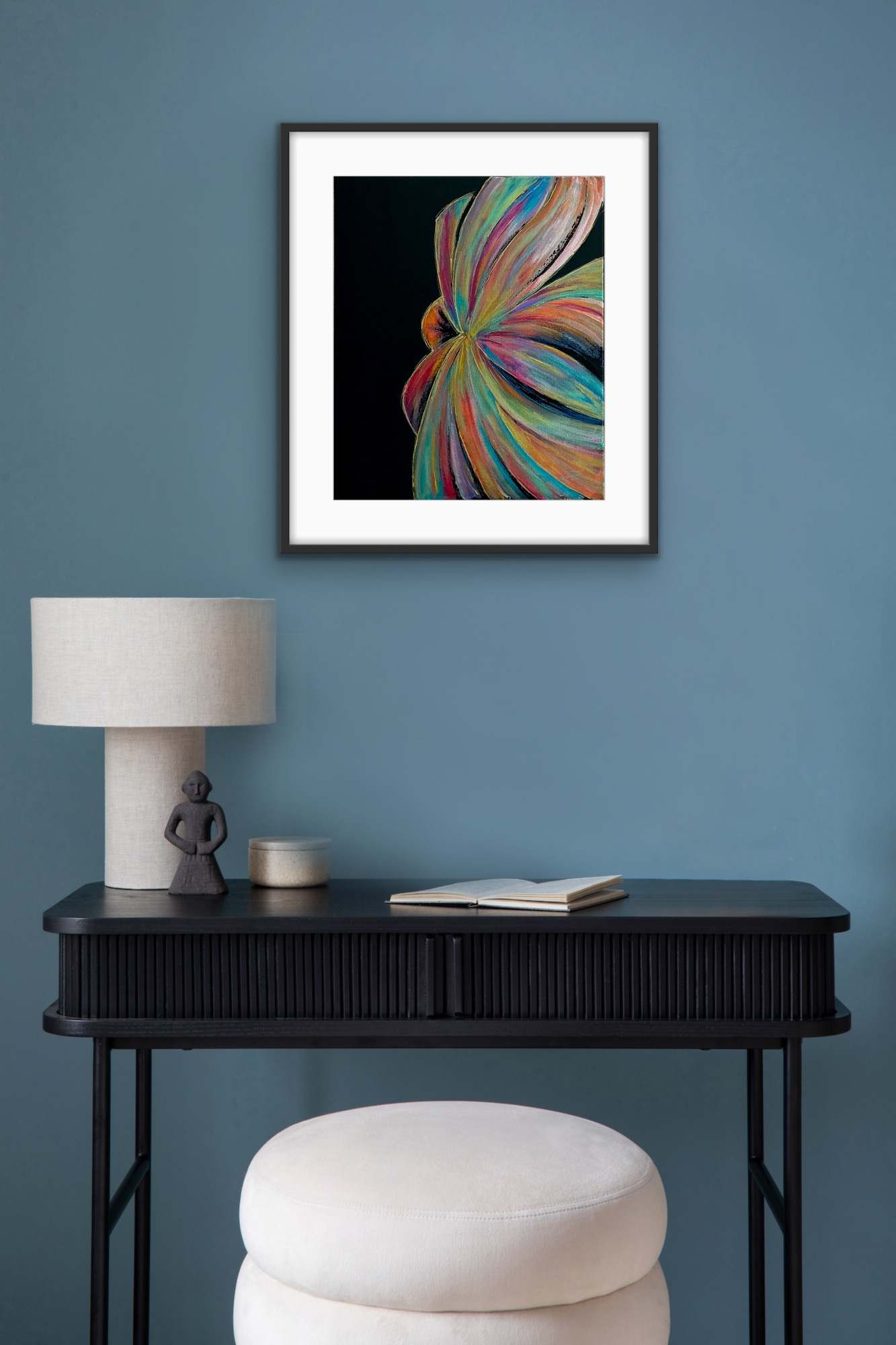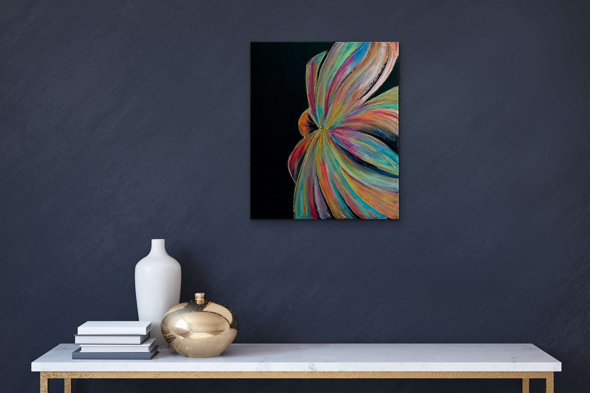 Parfaite pour une décoration intérieure contemporaine, bohème ou minimaliste, elle apporte une touche de mystère et de raffinement grâce à ses reflets irisés sur fond noir. Idéale dans un salon, une entrée ou un bureau, elle s’accorde particulièrement bien avec des meubles sobres et des matières naturelles, en soulignant la personnalité du lieu.